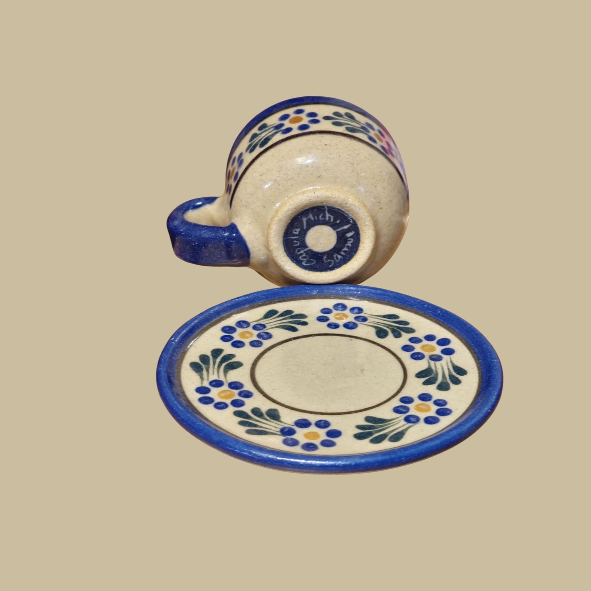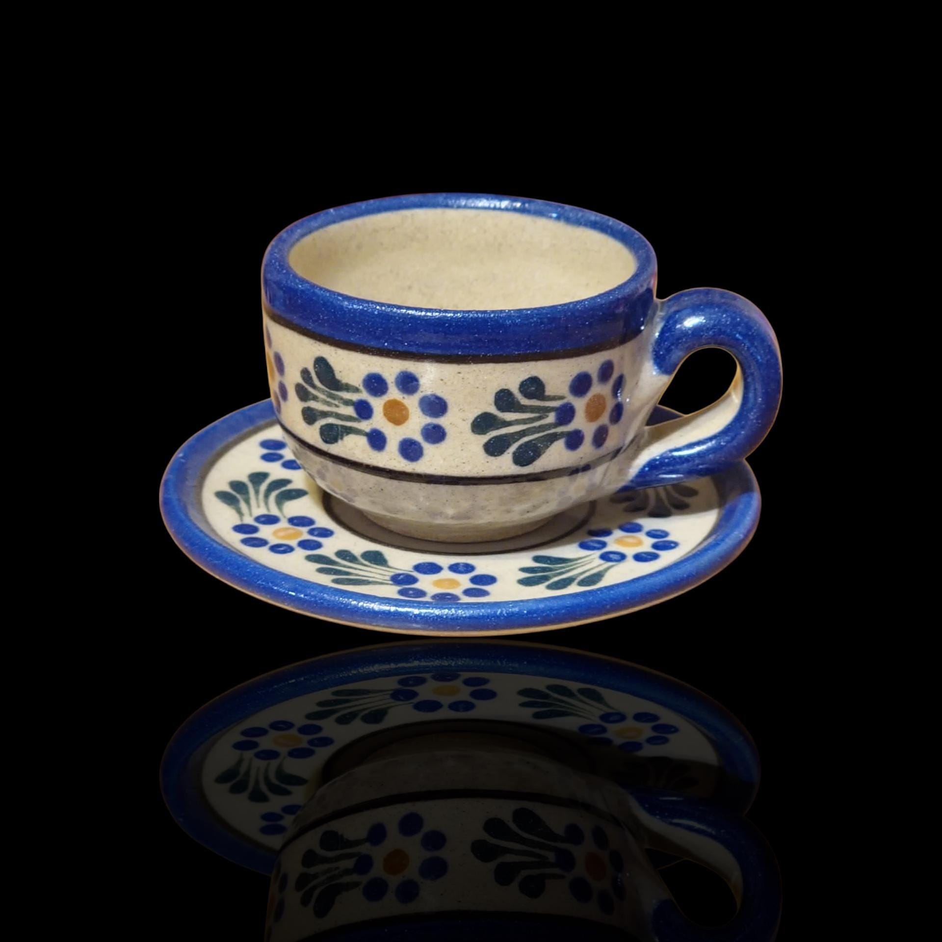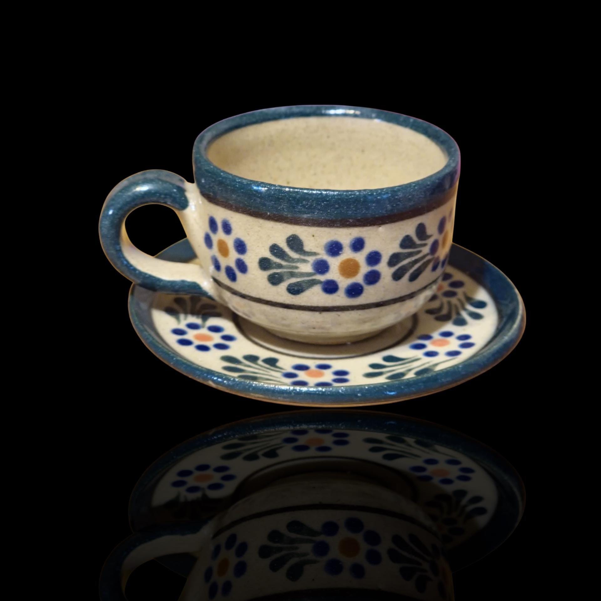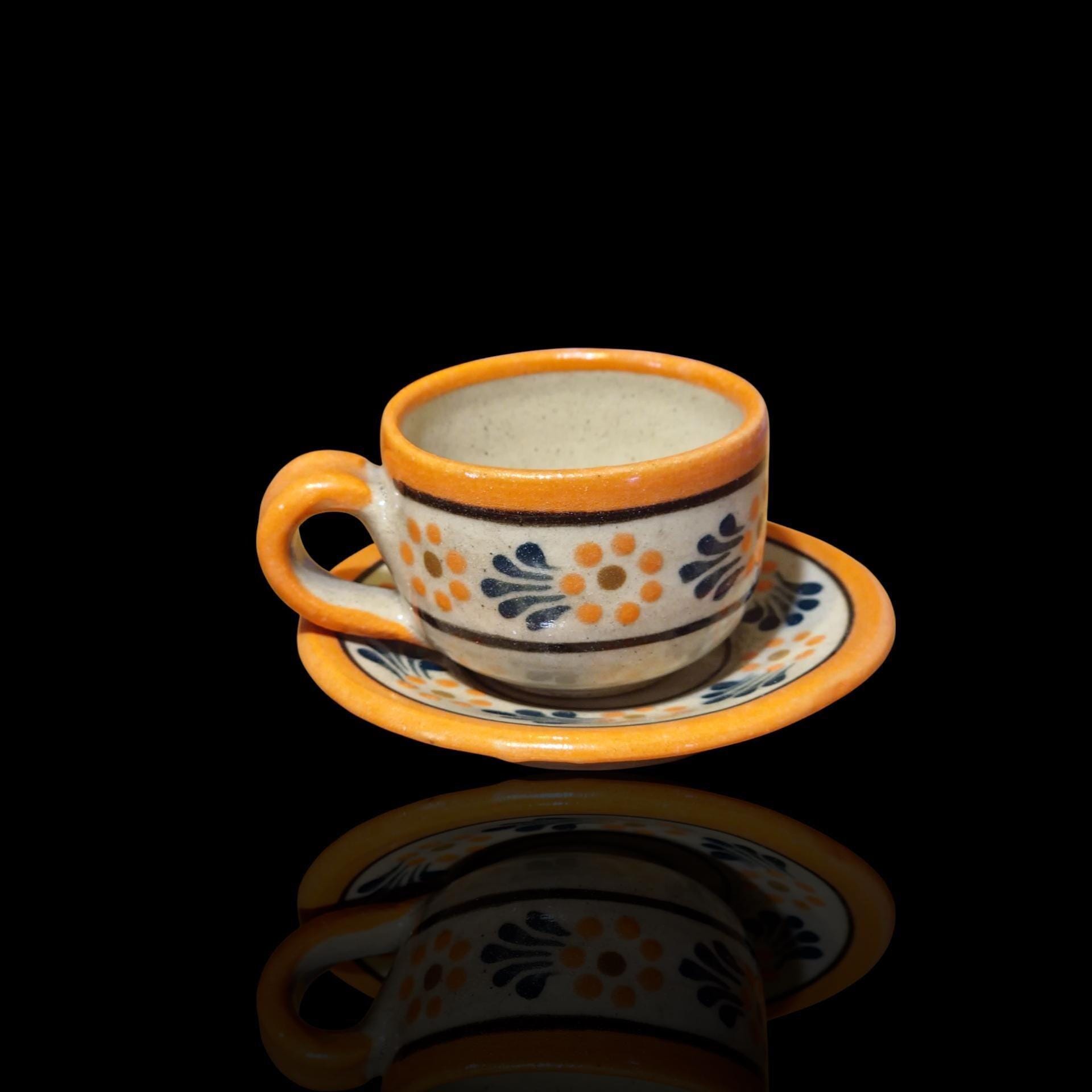 These rare espresso cups are more than just drinkware—they’re pieces of living tradition. Made in Capula, Michoacán, a town celebrated for its pottery, they are shaped from one of the finest natural clays in Mexico. The local soil is prized for its unique natural color, eliminating the need for added dyes or colorants, and has been used for centuries by artisans. Each cup is paired with a matching plate, both finished in the signature Capulineado dotted floral design and glossy shine. Perfectly sized at 1.5 fl. oz. (ideal for double espressos with rich foam), the cups measure 2" in diameter by 1.5" tall, while the plates measure 4" in diameter—a rare artisan set that blends function with history.
