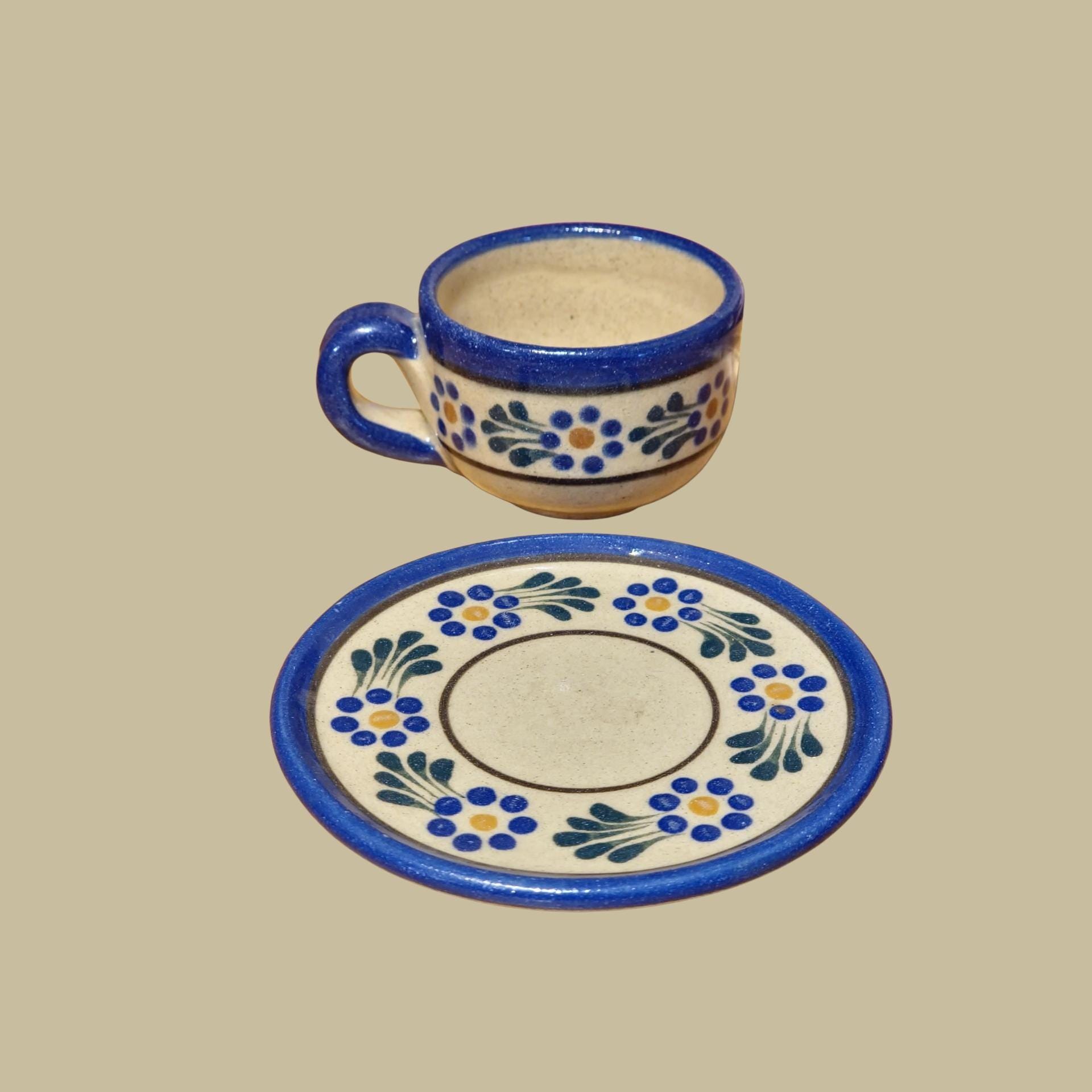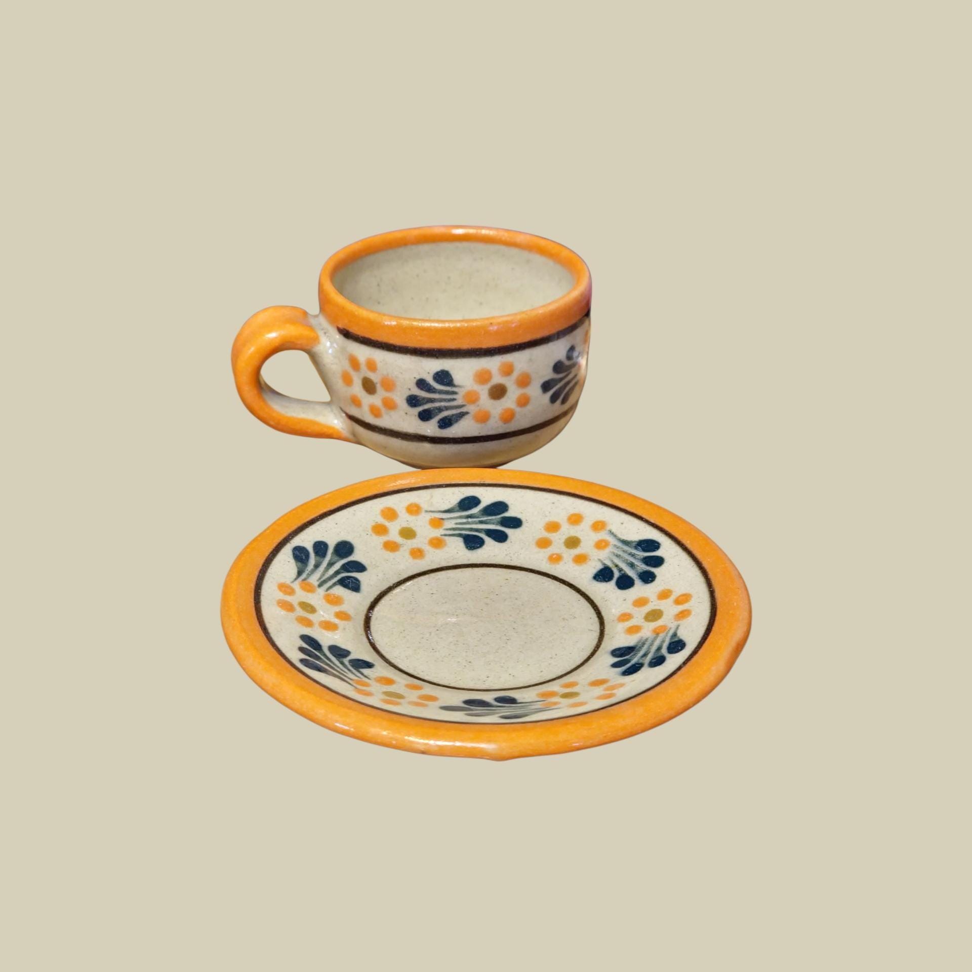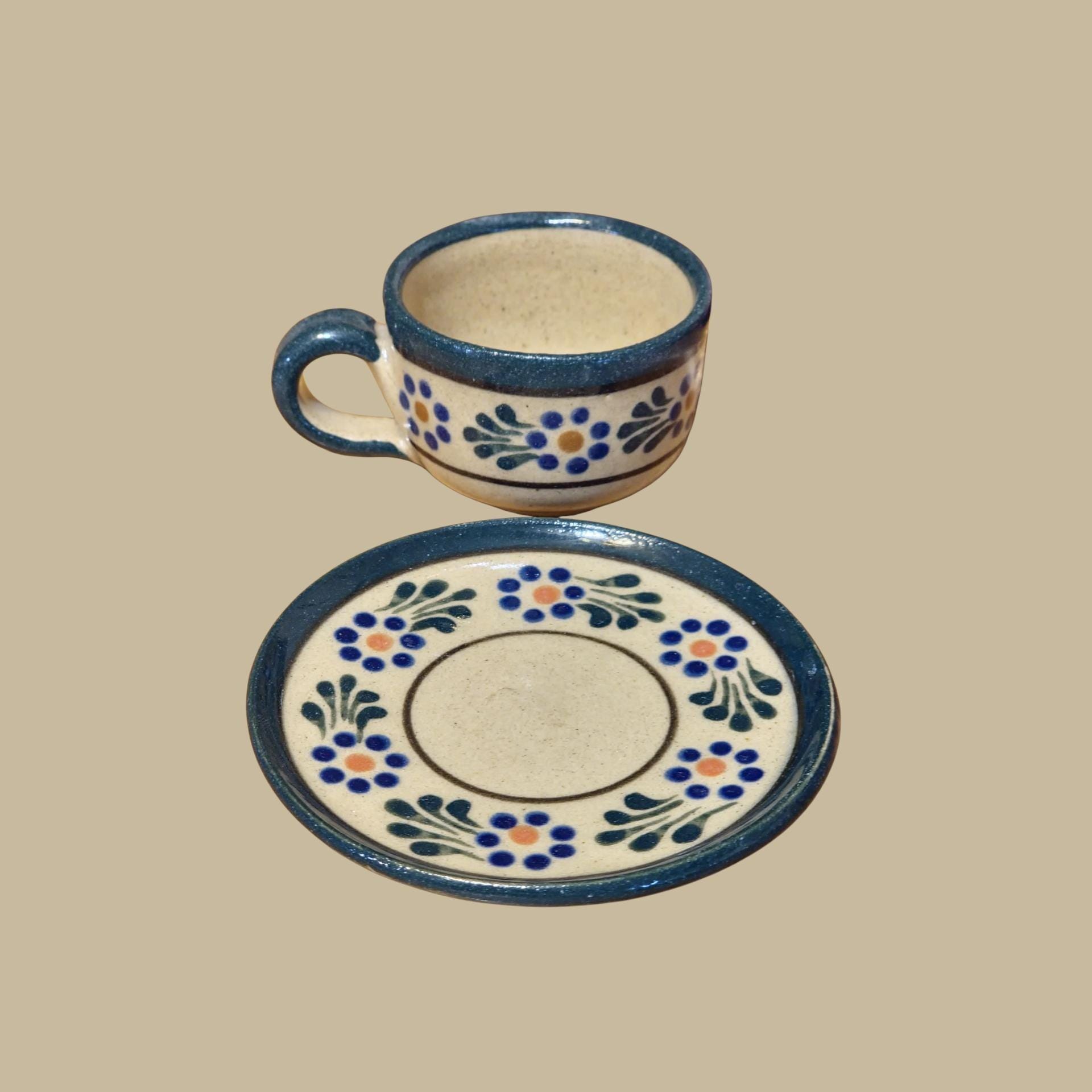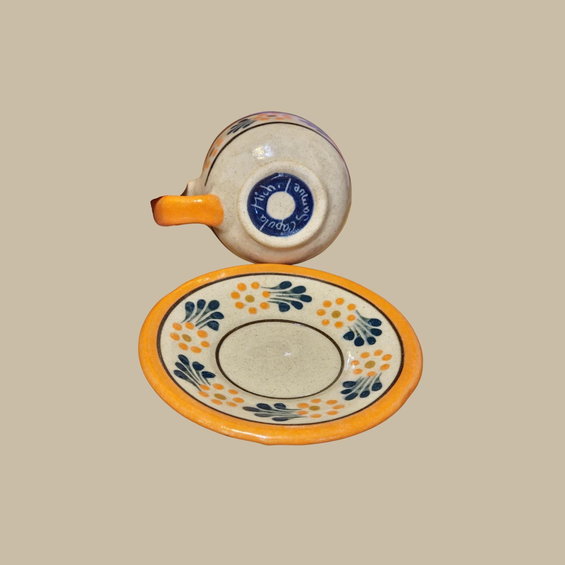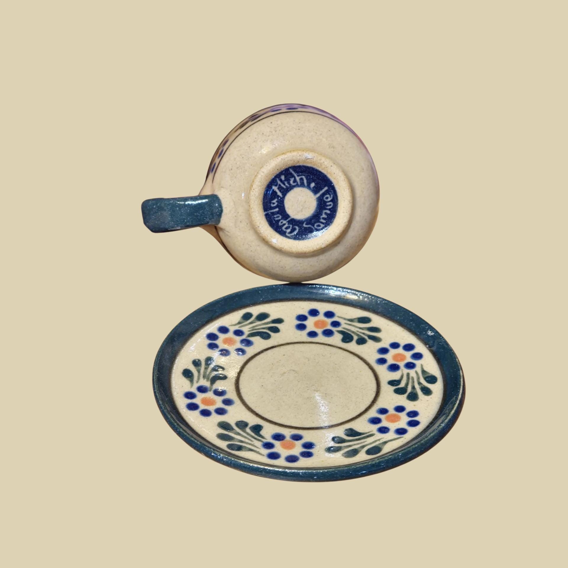 These rare espresso cups are more than just drinkware—they’re pieces of living tradition. Made in Capula, Michoacán, a town celebrated for its pottery, they are shaped from one of the finest natural clays in Mexico. The local soil is prized for its unique natural color, eliminating the need for added dyes or colorants, and has been used for centuries by artisans. Each cup is paired with a matching plate, both finished in the signature Capulineado dotted floral design and glossy shine. Perfectly sized at 1.5 fl. oz. (ideal for double espressos with rich foam), the cups measure 2" in diameter by 1.5" tall, while the plates measure 4" in diameter—a rare artisan set that blends function with history.