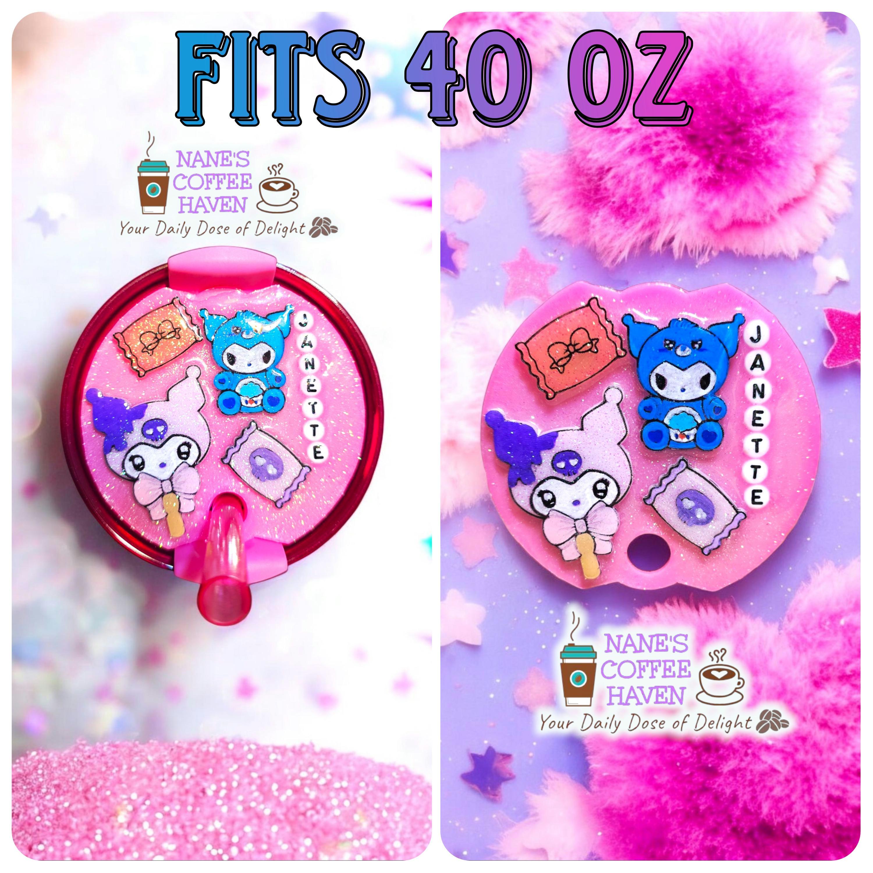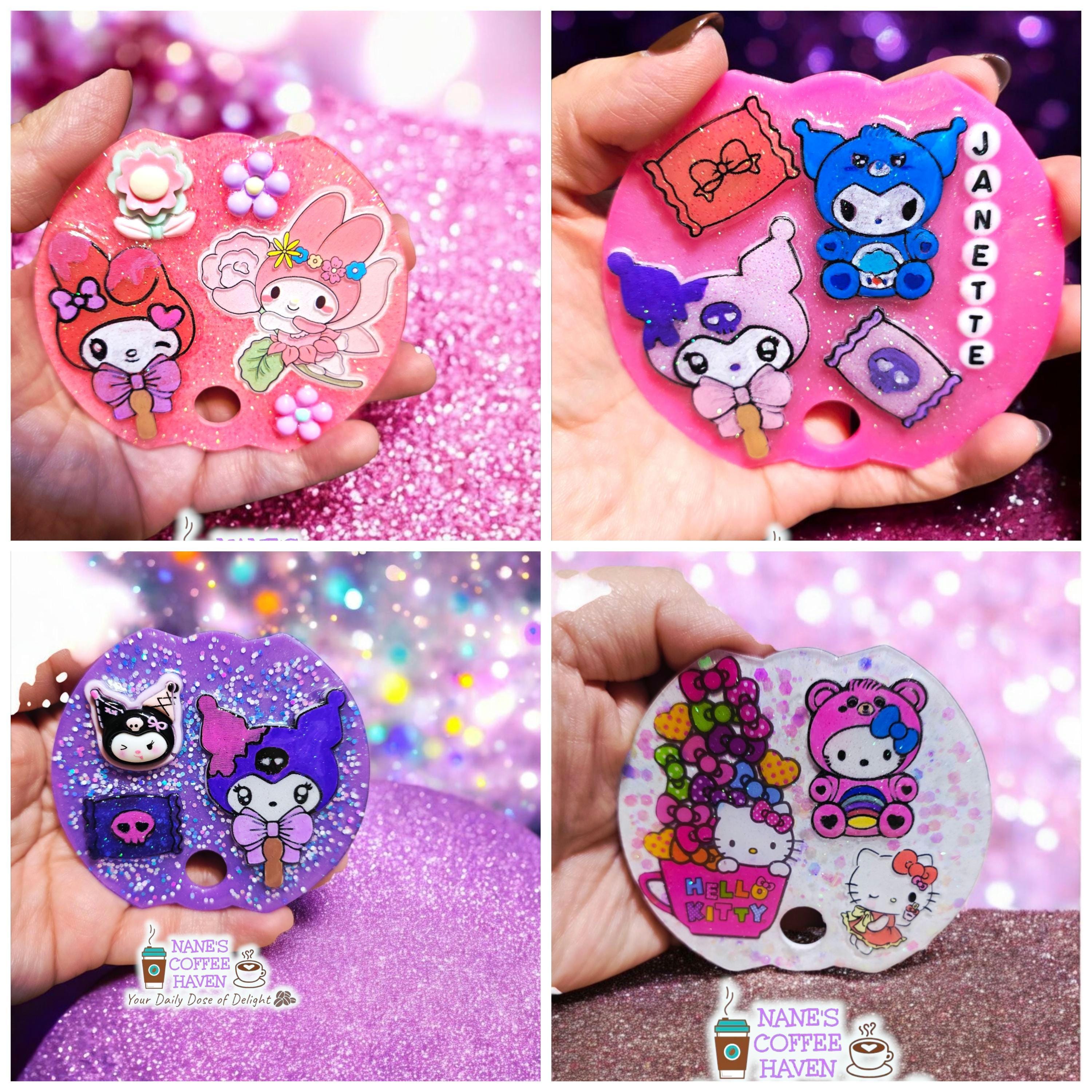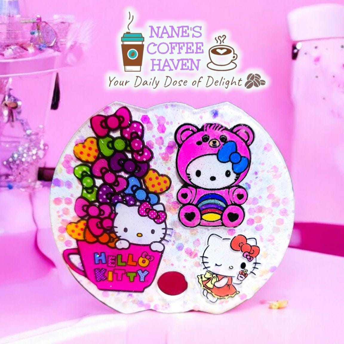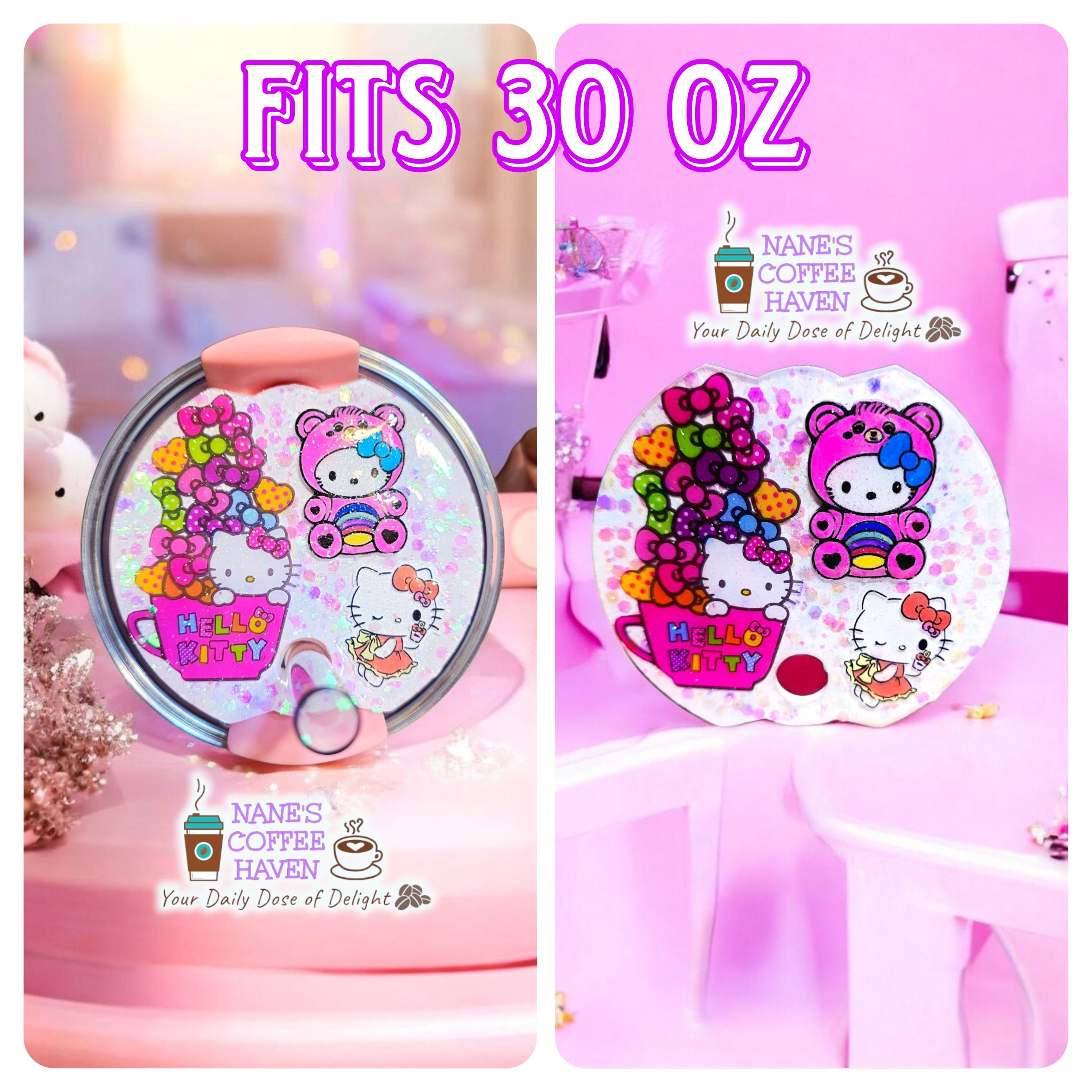 This handcrafted resin topper is designed to fit 30 oz & 40 oz Stanley cups, 30 oz Quencher lid tumblers, and features Hello Kitty and Friends Characters x Care Bears. Each piece is handmade with love using resin, glitter, resin charms, and vinyl stickers. I carefully handcrafted the characters and set them into the topper for a truly one-of-a-kind accessory.