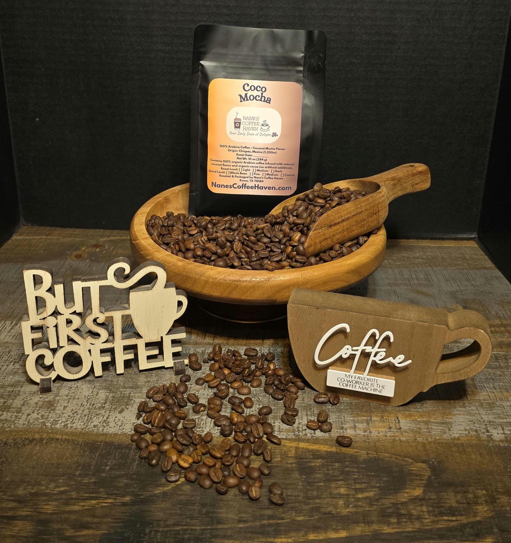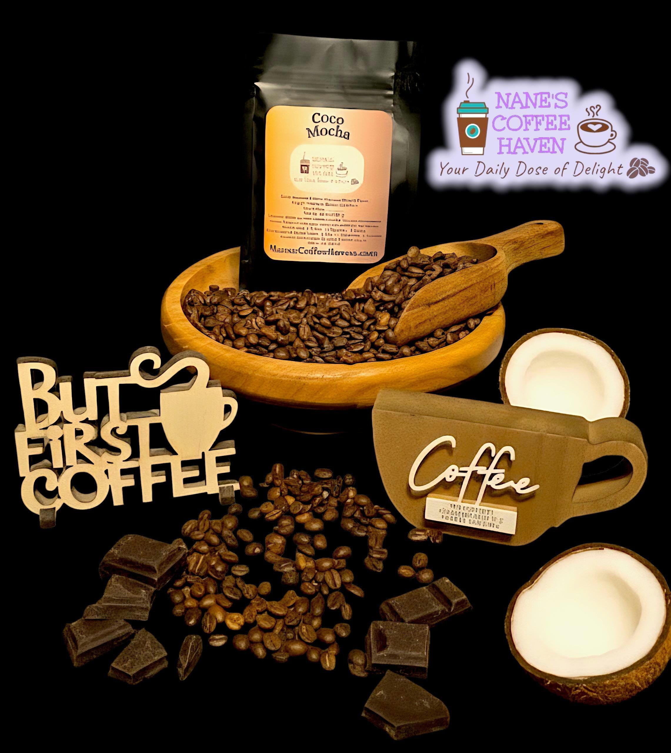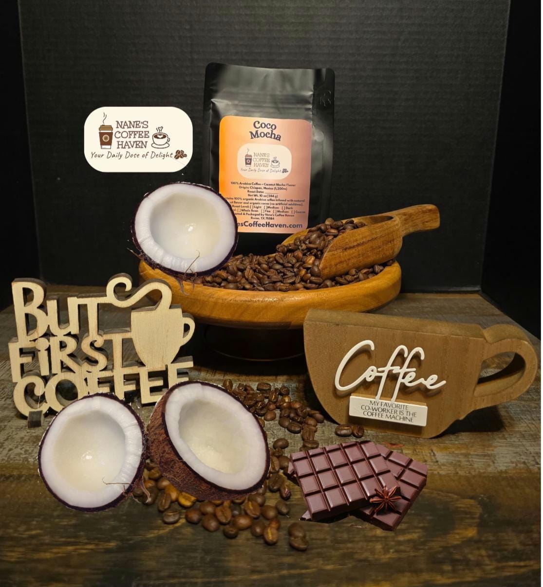 Coco Mocha Coffee – 10 oz Escape into the rich, tropical warmth of our Coco Mocha Coffee. Crafted with premium medium-roast Arabica beans from the high mountains of Chiapas, Mexico, this blend is infused with natural coconut flavor and organic cocoa — all with NO SUGAR ADDED. The result is a smooth, indulgent cup that balances deep chocolatey notes with a soft, creamy coconut aroma. Freshly prepared to order, each 10 oz bag comes in your choice of grind—fine, medium, or coarse—so you can enjoy a cup that’s velvety, aromatic, and irresistibly comforting.
