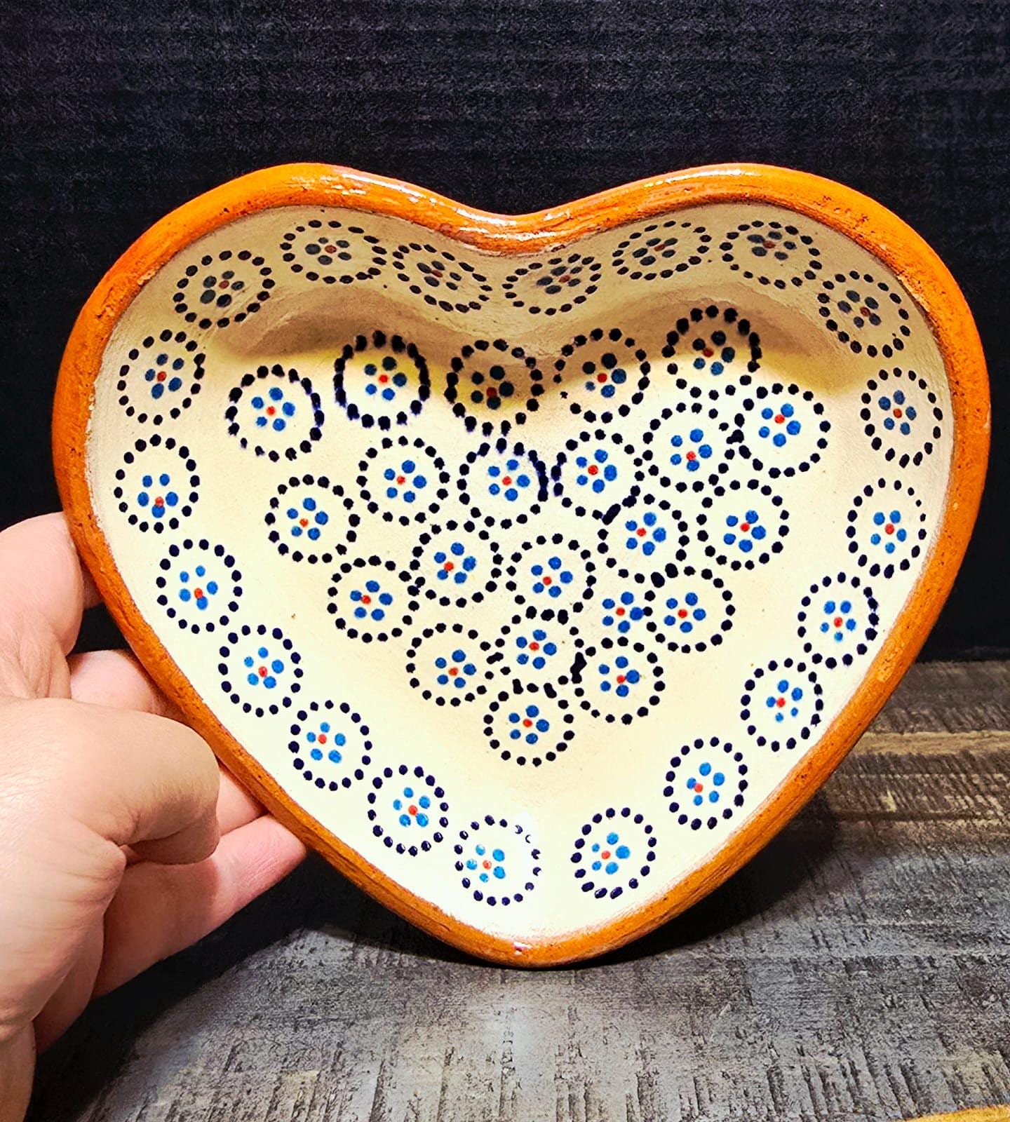 Choose your favorite colors! These beautiful handmade heart-shaped cups (approximately 10 fl oz capacity) come as a set with a matching heart-shaped plate, available in different sizes and color patterns. Each piece is truly one of a kind, and natural variations are part of their charm.